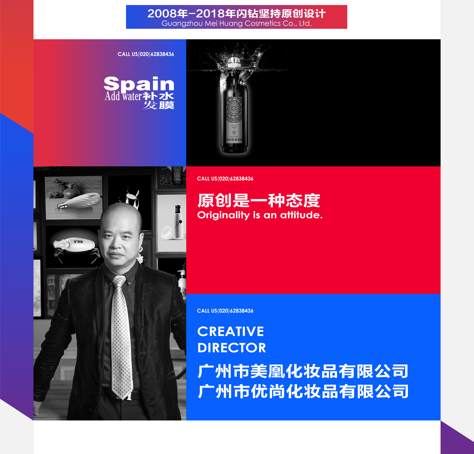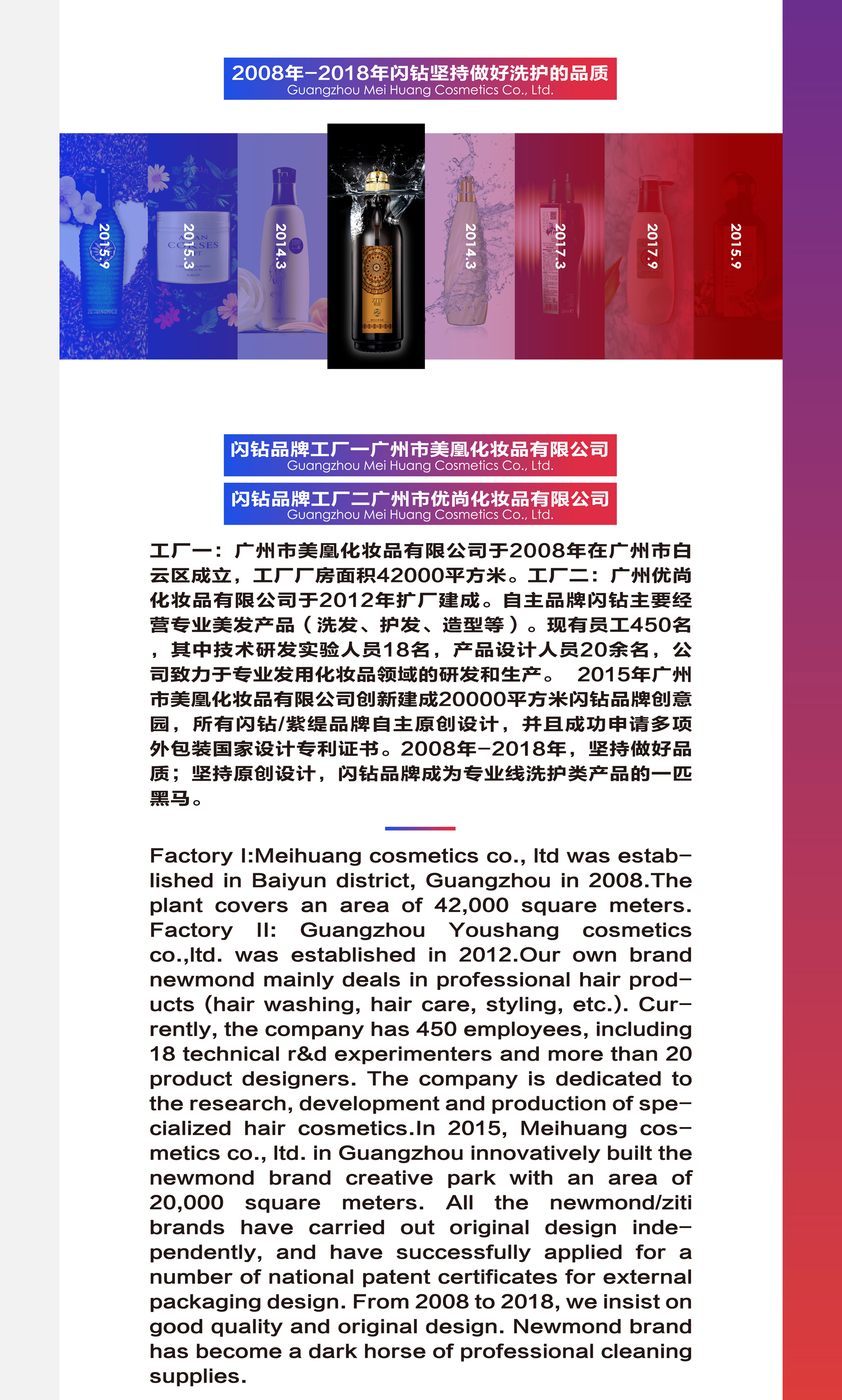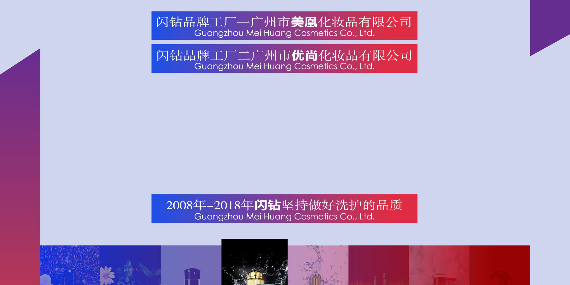 工厂一:广州市美凰化妆品有限公司于2008年在广州市白云区成立,工厂厂房面积42000平方米。工厂二:广州优尚化妆品有限公司于2012年扩厂建成。自主品牌闪钻主要经营专业美发产品(洗发、护发、造型等)。现有员工450名,其中技术研发实验人员18名,产品设计人员20余名,公司致力于专业发用化妆品领域的研发和生产。 2015年广州市美凰化妆品有限公司创新建成20000平方米闪钻品牌创意园,所有闪钻/紫缇品牌自主原创设计,并且成功申请多项外包装国家设计专利证书。2008年-2018年,坚持做好品质;坚持原创设计,闪钻品牌成为专业线洗护类产品的一匹黑马。