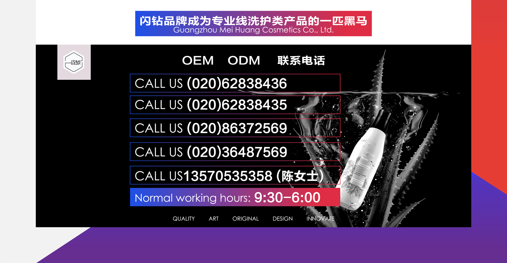 Factory I:Meihuang cosmetics co., ltd was established in Baiyun district, Guangzhou in 2008.The plant covers an area of 42,000 square meters. Factory II: Guangzhou Youshang cosmetics co.,ltd. was established in 2012.Our own brand newmond mainly deals in professional hair products (hair washing, hair care, styling, etc.). Currently, the company has 450 employees, including 18 technical r&d experimenters and more than 20 product designers. The company is dedicated to the research, development and production of specialized hair cosmetics.In 2015, Meihuang cosmetics co., ltd. in Guangzhou innovatively built the newmond brand creative park with an area of 20,000 square meters. All the newmond/ziti brands have carried out original design independently, and have successfully applied for a number of national patent certificates for external packaging design. From 2008 to 2018, we insist on good quality and original design. Newmond brand has become a dark horse of professional cleaning supplies.